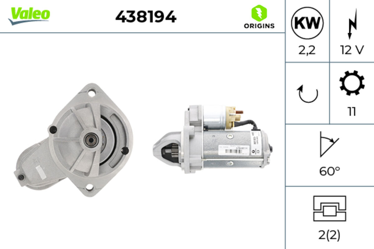 N° denti : 11, N° fori fissaggio : 2, Potenza motore avviamento [KW] : 2,2, Qualità : Valeo New, Tensione [V] : 12